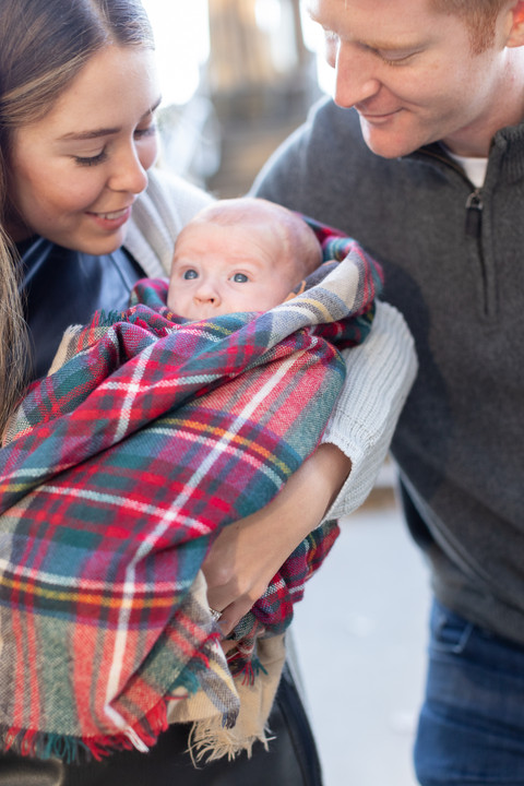 Lana and I styled their family session together. To start, we decided on Lana's dress and built the rest of the look around her outfit. We paired Lana's dress with earth tone accessories. We kept Eric's outfit simple with dark jeans, a pullover sweater, and dress shoes. Once again we used my favourite trick of using a women's scarf to wrap around their baby Finn. I think it brought the whole look together.